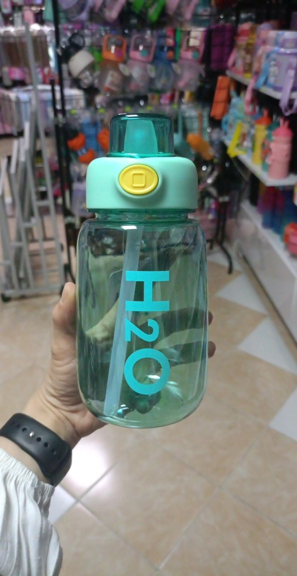 Renkli turkuaz suluk sarı düğmeli kapak ve 'H2O' yazılı şeffaf gövdeye sahiptir. Kolay içim için pipet içerir.
