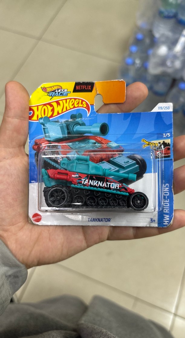 Renkli turkuaz Hot Wheels oyuncak tank arabası, Tanknator tasarımlı ve Netflix markalı. Sınırlı serinin 119/250 numarası.