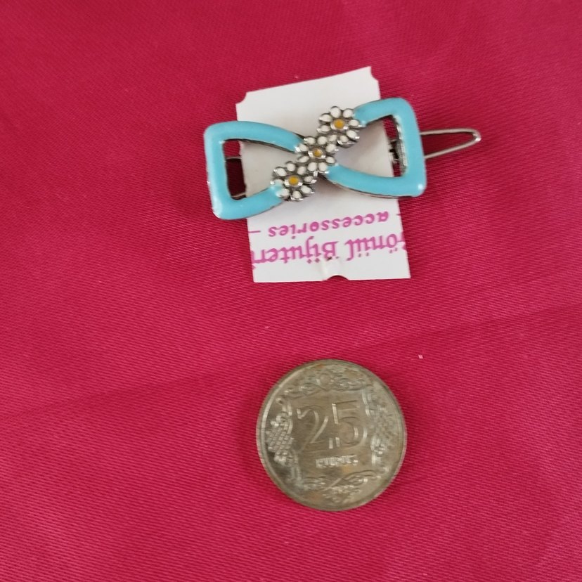 Renkli turkuaz renkte, toka şeklinde, tokalı ve papatya desenli çocuk saç aksesuarı.