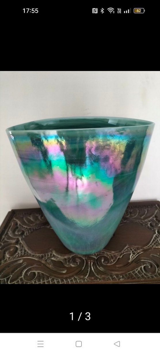 Pembe, yeşil ve mavi tonlarında yansımalarla renkli turkuaz vazo. Parlak ve pürüzsüz yüzeye sahip, yuvarlak formda.