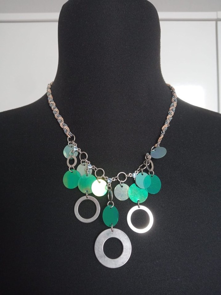 Renkli turkuaz tonlarında zincir detaylı, işleme desenli midi uzunlukta kolye. Parti ve çağdaş bohem tarzlara uygun.