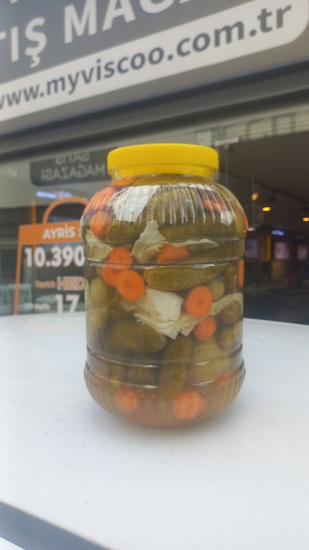 Sarı kapaklı, renkli turşu kavanozu. İçinde salatalık turşusu ve havuç dilimleri bulunur.