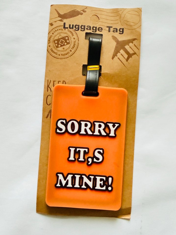 Canlı turuncu renkte, "SORRY IT'S MINE!" yazılı bavul etiketi ✈️