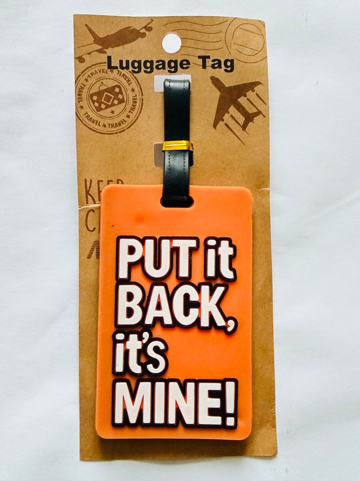Canlı turuncu renkte, üzerinde 'PUT it BACK, it's MINE!' yazan bavul etiketi. Siyah kayışı ile kolayca bavulunuza takılır.