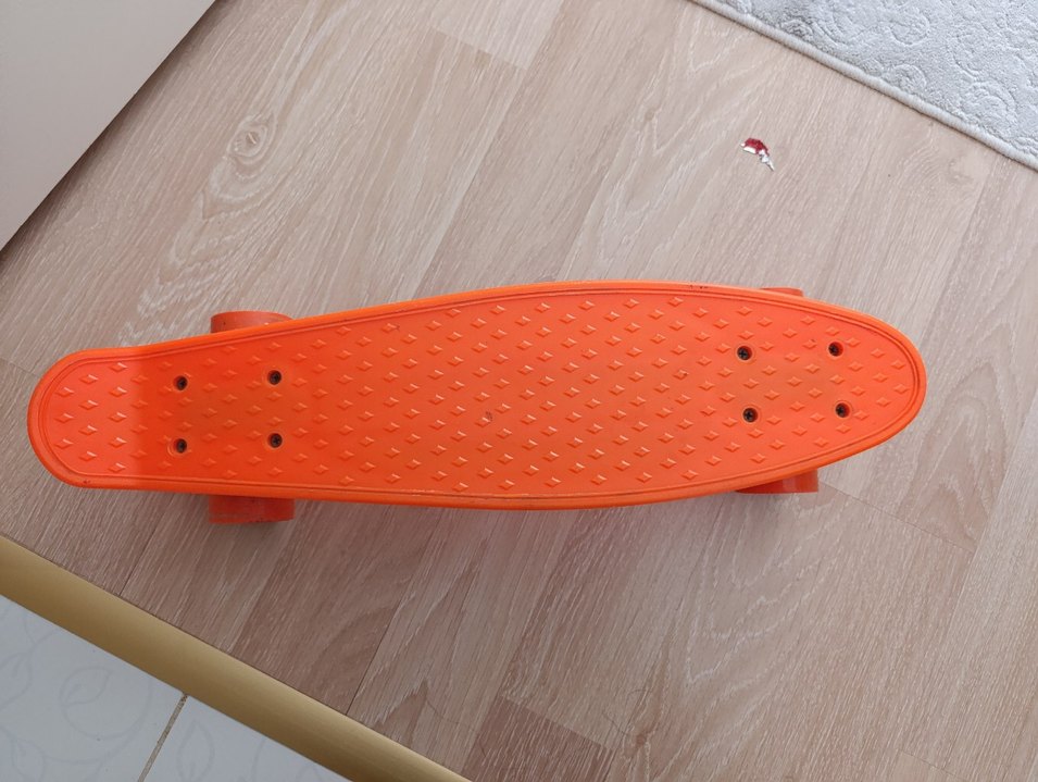 Renkli turuncu tabanı kaymaz yüzeye sahip çocuk scooterı, eğlenceli ve güvenli sürüş sağlar.