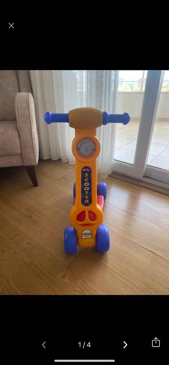 Renkli turuncu gövdeye, mavi tutacak ve tekerleklerle donatılmış çocuk scooterı. Ürünü kızım sevmedi ev içinde hiç dışarı çıkmadı yeniden farksız Pilsan marka