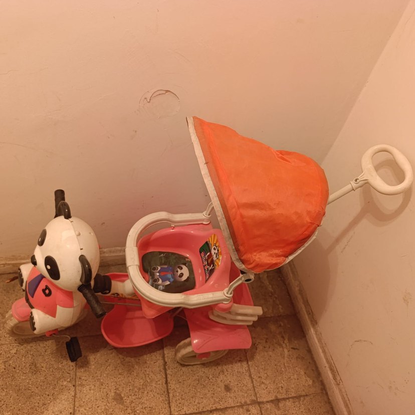 Renkli turuncu tente ve pembe oturağı olan çocuk üç tekerlekli bisiklet, dayanıklı yapıya ve tekerleklere sahiptir.