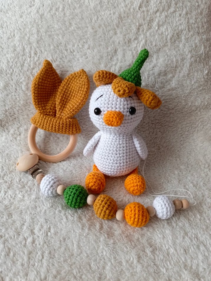 Renkli turuncu diş kaşıyıcı ve çıngırak seti; tığ işi hayvan figürü, kulaklı halka ve boncuklu klips içerir.
