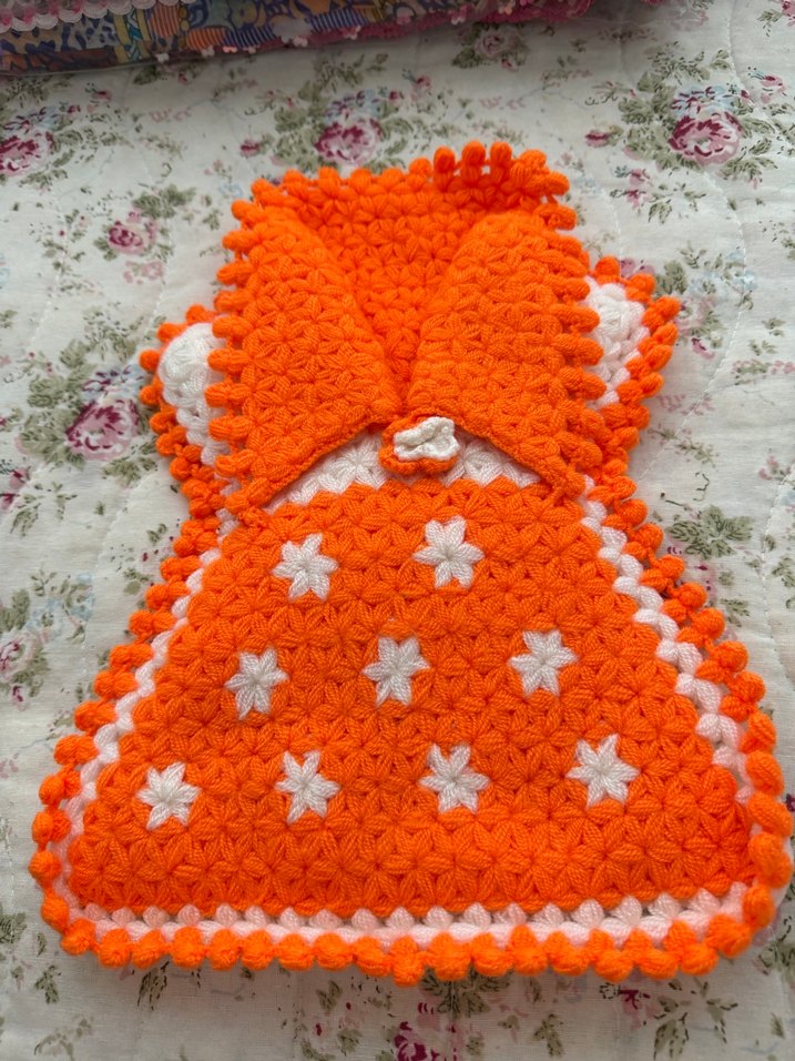 Yumuşak iplikten yapılmış, beyaz yıldız desenli renkli turuncu el örgüsü banyo süngeri.