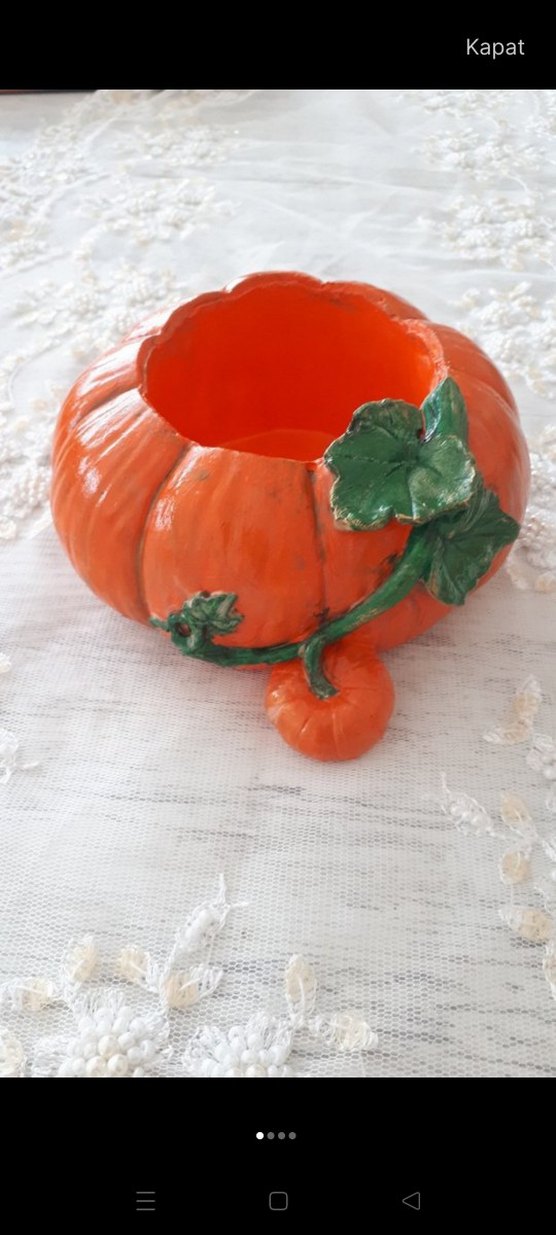 Detaylı yeşil yapraklara sahip, canlı renkte turuncu kabak figürin. Dekorasyon için uygun.