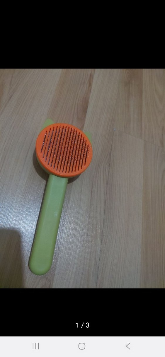 Turuncu kıllı ve yeşil saplı renkli kedi tüy fırçası, kedilerin tüy bakımında kullanılır.