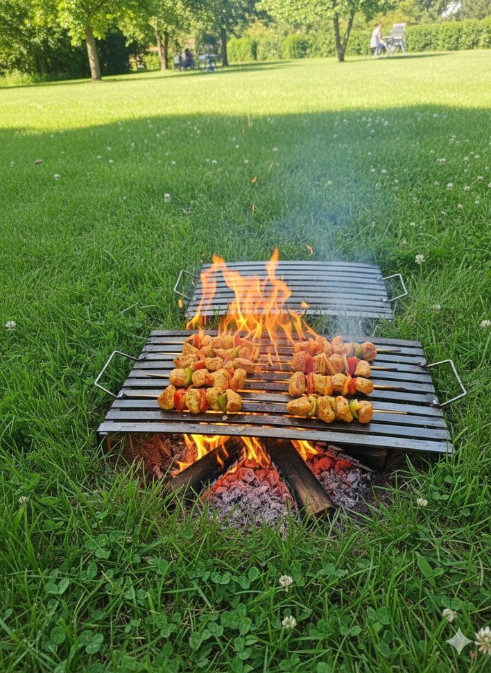 Açık ateş üzerinde renkli turuncu mangal ızgarası, çimlerin üzerinde şişleri pişirmek için kullanılıyor.