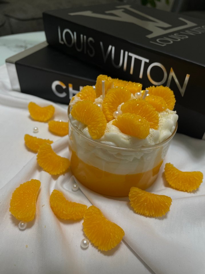 Renkli turuncu mum, beyaz kremalı ve portakal dilimli dekorasyonla, inci detaylarıyla beyaz bez üzerine yerleştirilmiştir. ️