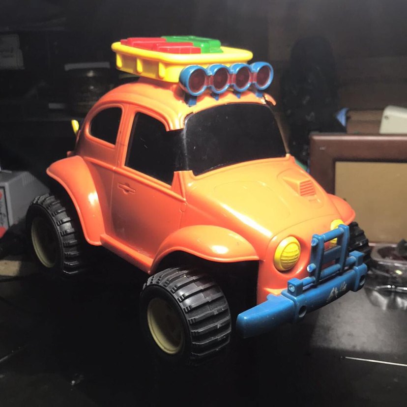 Turuncu gövde, büyük siyah lastikler ve mavi ön tamponlu renkli oyuncak araba. Üstünde tavan lambaları ve sarı-yeşil bagaj rafı bulunur.