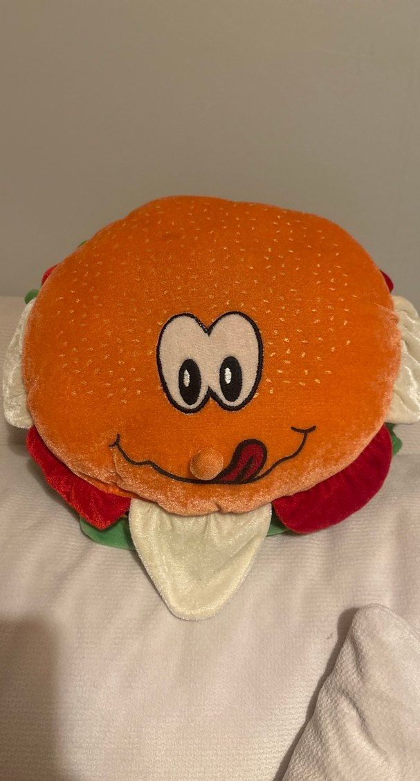 Renkli turuncu peluş oyuncak, neşeli yüzlü hamburger şeklinde, yumuşak dokusu ile sarılmaya uygun.