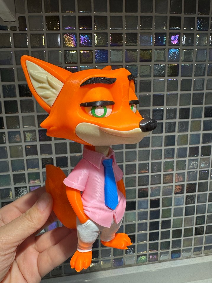 Renkli turuncu tilki figürü, pembe gömlek ve mavi kravatla, detaylı ve ifadeli yeşil gözlere sahip. Kendi 3D baskım olan tilki yaklaşık 13 cm her boyutu yapılır.