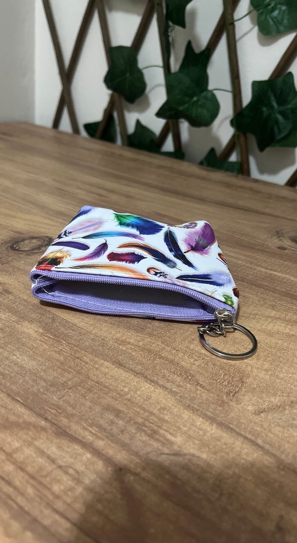 Sentetik kumaştan, renkli tüy desenli, fermuarlı ve anahtarlıklı kadın cüzdan. Günlük kullanıma uygun, bohem tarzda.