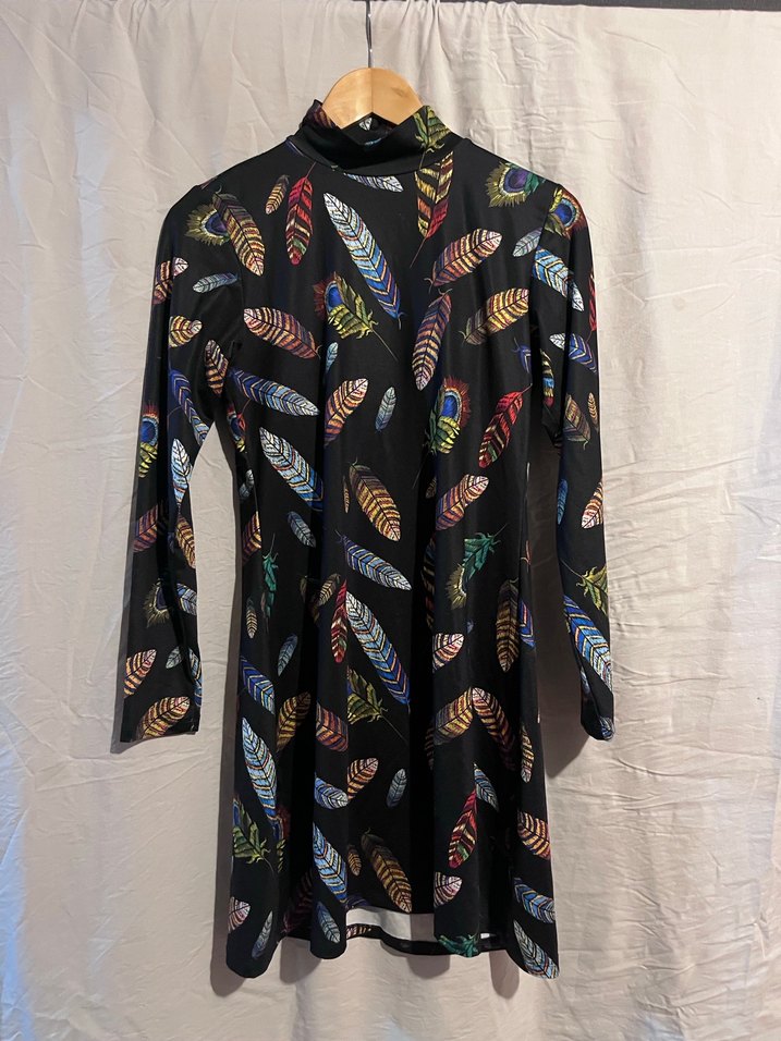 Yumuşak sentetik kumaştan yapılmış, yüksek yakalı, drapeli ve renkli tüy desenli bu elbise, uzun kollu ve vücuda oturan kesime sahiptir. Mayo kumaşından, hızlı kurur iç astarı da mevcut göğüs kısmında alt taytıyla birlikte gönderilecek.