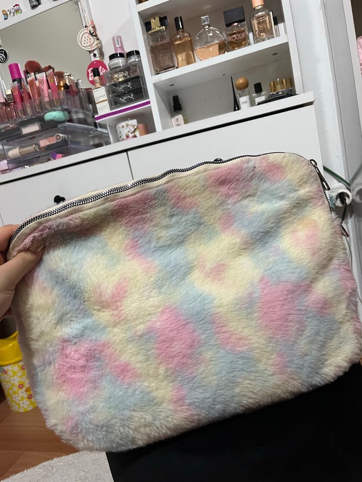Bu kadın çantası, çok renkli pastel bağlama desenli ve yumuşak tüy detaylı yüzeye sahiptir, rahat bohem sokak stili için uygundur.