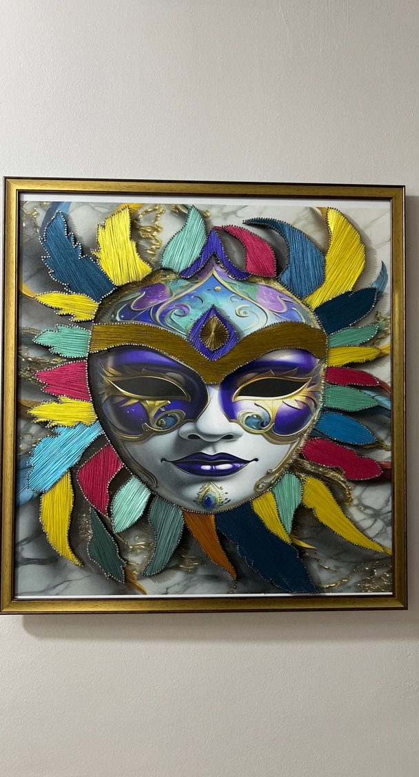Canlı renklerde tüy detaylarına sahip kadın maskesi dekoru. Her mekana sanatsal bir dokunuş katar.