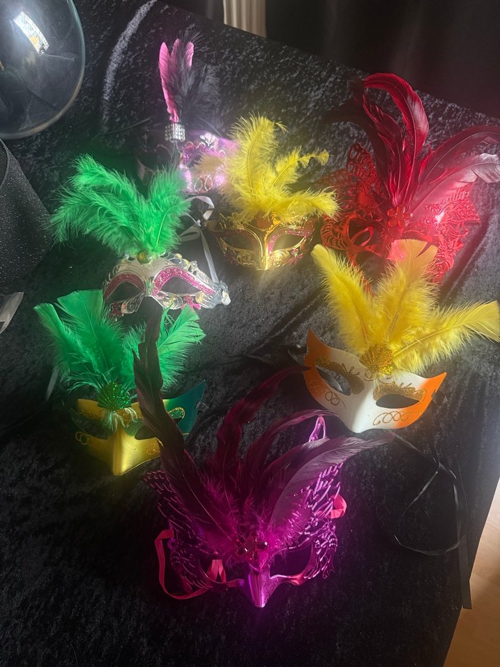 Çeşitli canlı renklerde tüy detaylı renkli karnaval maskeleri, şenlikli etkinlikler için uygun. Tane 200