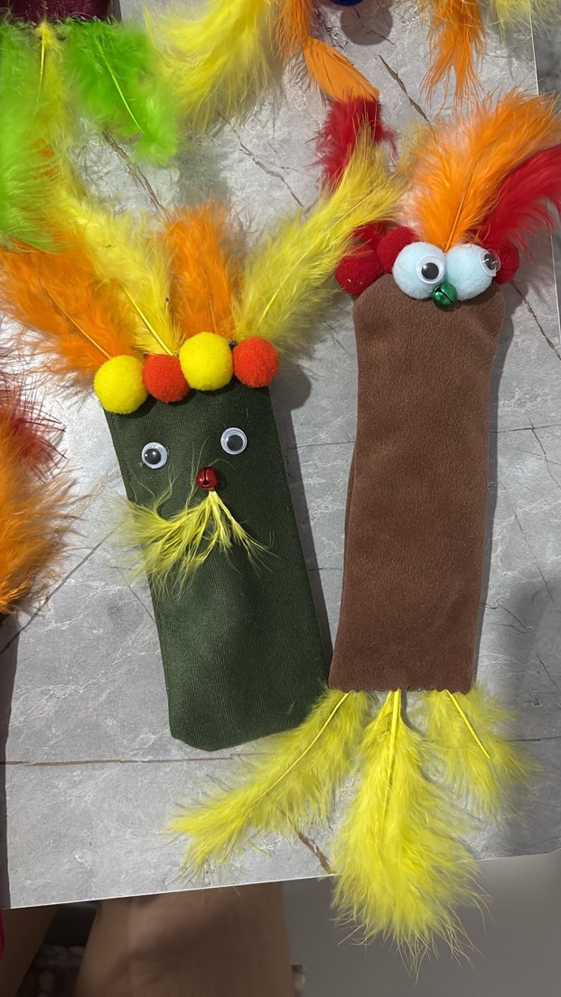 Yumuşak kumaş gövdeli, canlı tüyler ve oyuncu gözlerle renkli kedi oyuncakları, kedilerin ilgisini çekmek için tasarlandı .