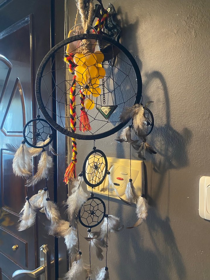 Çok renkli ve koyu tonlarda tüy detaylı rüya kapanı, ev duvarları için dekoratif bir üründür.