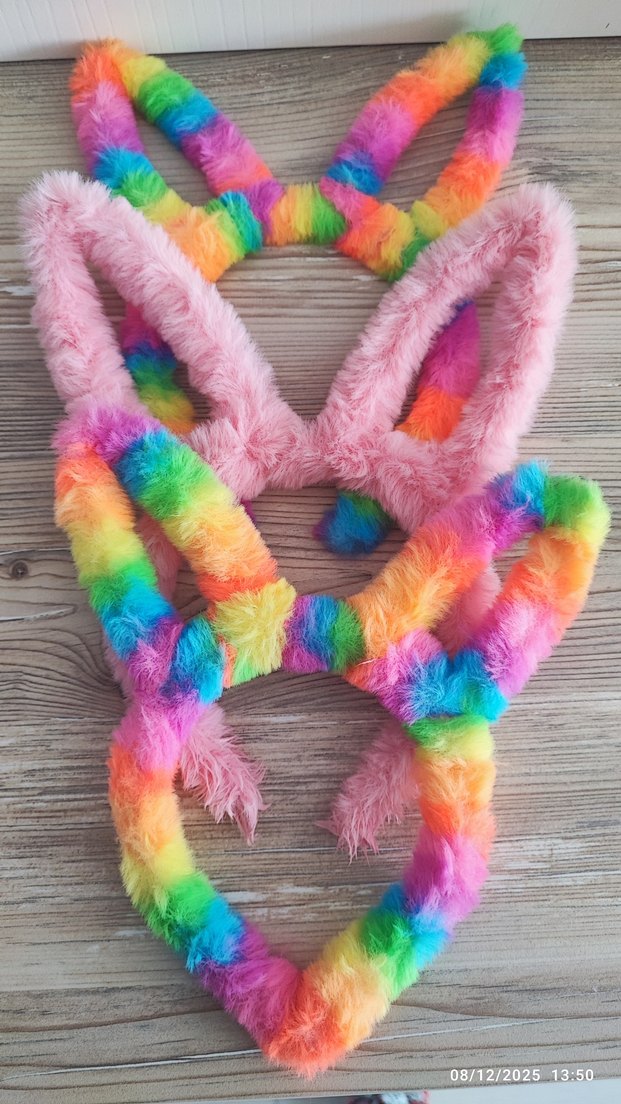 Yumuşak tüylü detaylara sahip, renkli tie-dye desenli çocuk saç bantları. Bohem ve retro tarzı için uygun, sevimli tavşan kulaklı tasarım.