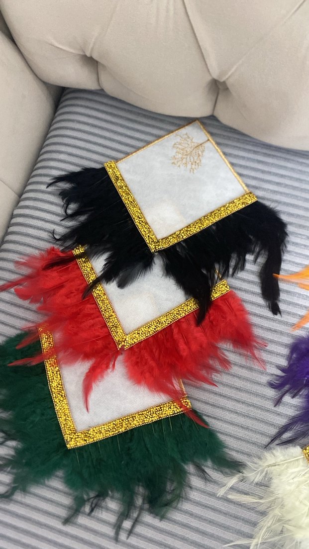 Altın şeritli renkli tüyler peçetelikler siyah, kırmızı ve yeşil renk seçenekleriyle sunulur.