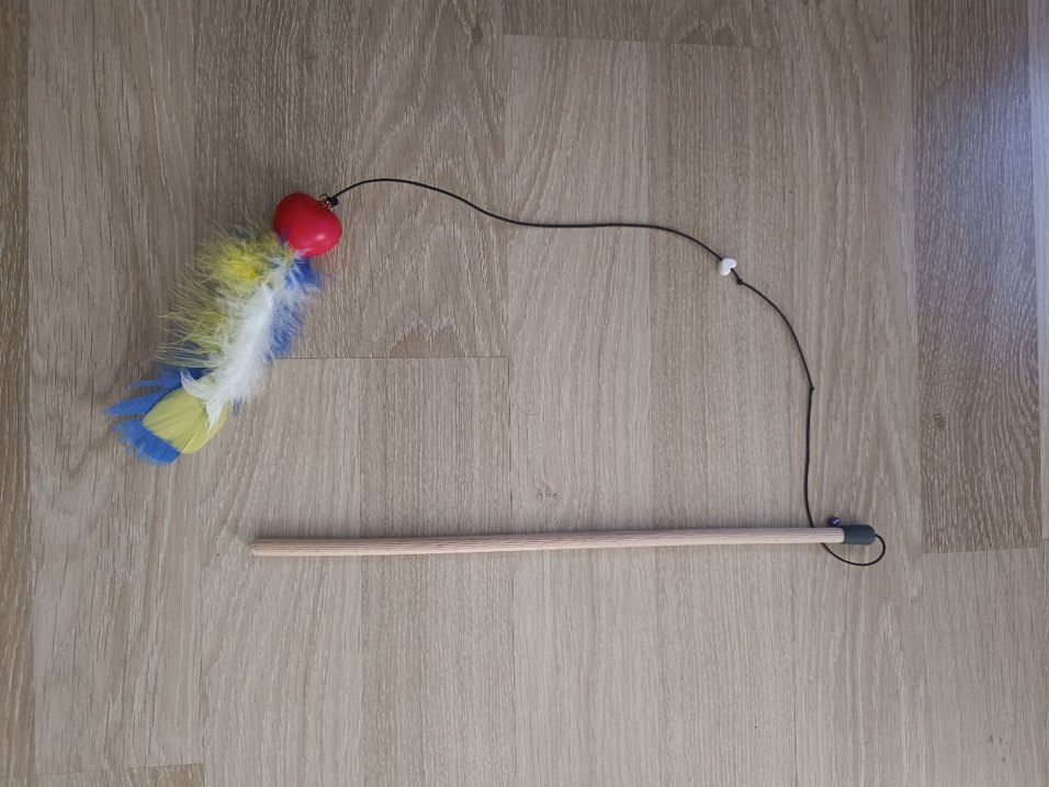 Tüylü renkli kedi oltası oyuncağı, tahta çubuk ve ip ile eğlenceli oyun sağlar.