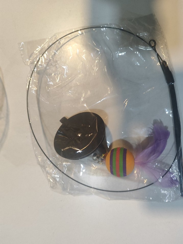 Renkli çizgili top ve mor tüylerin bağlı olduğu esnek tel ve siyah tabanlı kedi oyuncağı.
