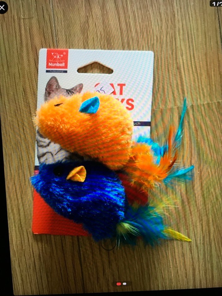 Yumuşak tüylü, tüy detaylı renkli kedi oyuncakları. Canlı turuncu ve mavi parçalar içerir.