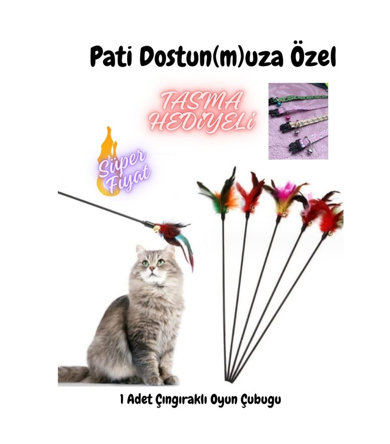 Kedinizin ilgisini çekmek için renkli tüylü çubuklu oyuncak seti.Çingirakli Tasma Hediye'li 1+1 adet fiyatıdır...