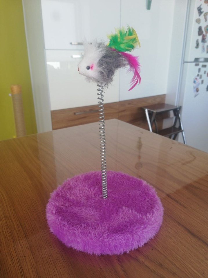 Yumuşak tabanlı mor renkli kedi oyuncağı, yay üzerinde tüylerle süslenmiş fare figürü içerir .Aldık benim kedim yaşlı oynamadı oyüzden satılık.