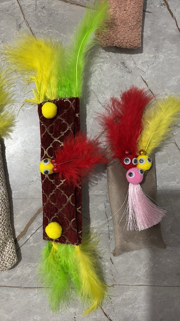 Parlak tüylere ve ponponlara sahip renkli kedi oyuncakları, kedilerin ilgisini çekmek için tasarlanmıştır.