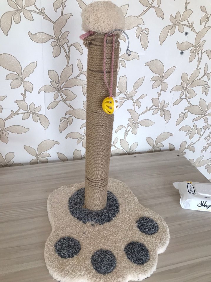 Renkli, tüylerle kaplı pati şeklinde tabanı ve ip sarılı dikey direği olan, asılı çanlı oyuncaklı kedi tırmalama tahtası. Ürün göründüğü gibidir