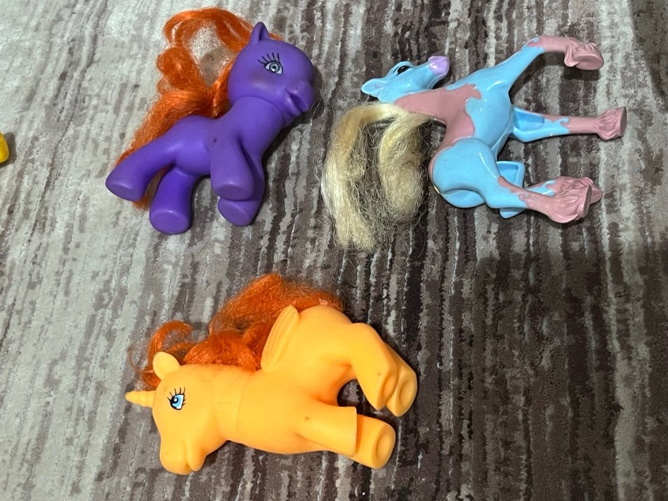 Mor, mavi ve turuncu renklerde, canlı saçlara sahip üç at figürü. Detaylı yüz ifadeleri ve akan yeleleri bulunur. “Tek fiyatıdır”