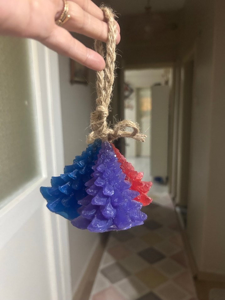 Mavi, mor ve kırmızı renklerde üçlü çam ağacı şeklinde mis kokulu sabunlar doğal ip ile bağlanmıştır.
