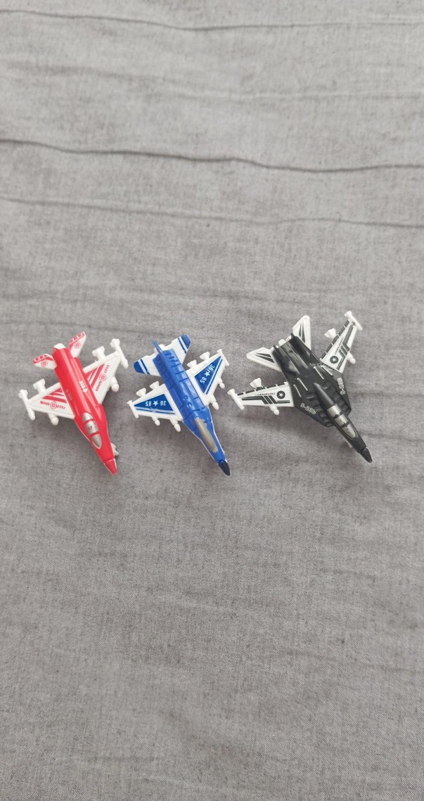 Kırmızı, mavi ve siyah renklerde detaylı tasarımlı üçlü jet uçak oyuncak seti. Koleksiyon veya oyun için uygundur. ✈️