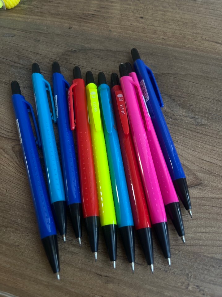 Farklı renklerde, siyah uçlu ve tıklamalı mekanizmalı uçlu kalem ✏️