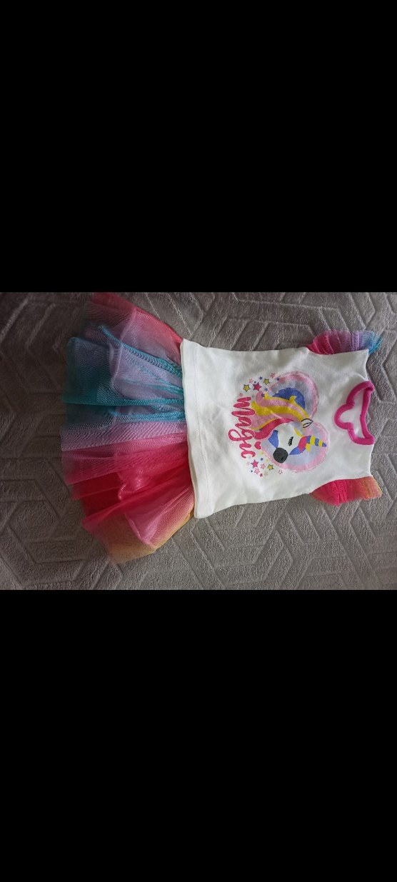 Kısa kollu, bisiklet yaka ve fitted kesime sahip renkli kız takım. Önünde canlı unicorn baskısı ve çok renkli fırfırlı etek bulunur. Yumuşak sentetik kumaştan yapılmıştır.