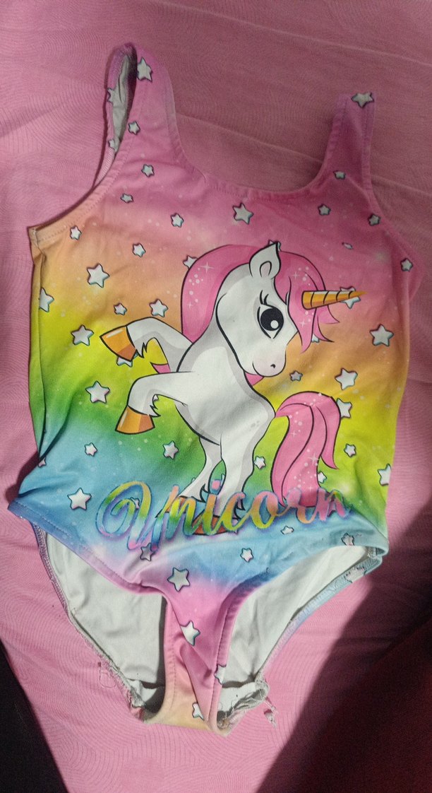 Kolsuz, renkli baskılı unicorn ve yıldız desenli kız mayosu, plaj için uygun. Canlı renkleri ve pop kültür tarzıyla dikkat çeker.