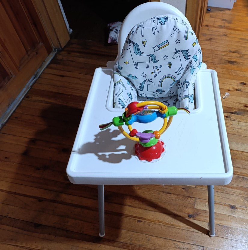 Beyaz tepsi ve canlı renklerde oyuncaklı, unicorn desenli renkli bebek mama sandalyesi.