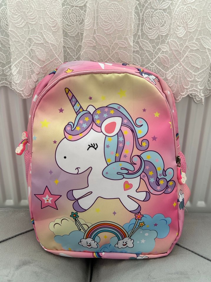 Yıldızlar, gökkuşağı ve bulutlarla süslenmiş unicorn desenli renkli çocuk okul çantası. Anaokulu için uygundur kullanılmadı
