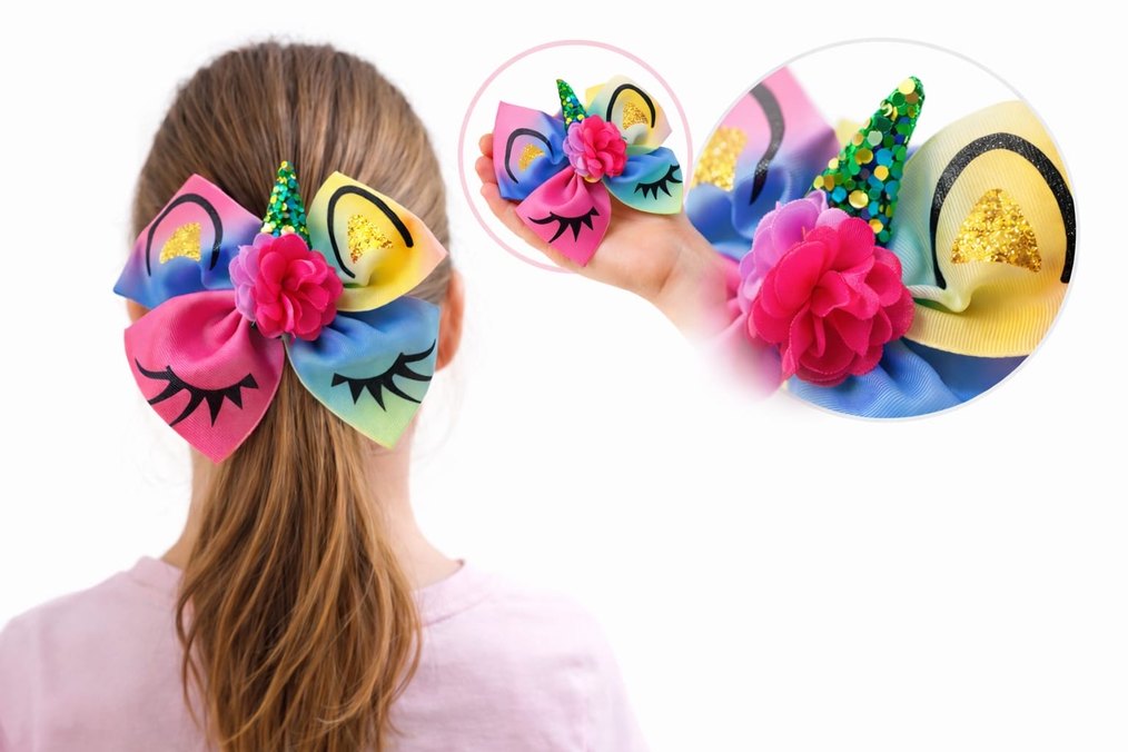Renkli unicorn desenli çocuk saç tokası, fiyonk ve batik desenli. Neşeli detaylarla bohem tarzı için uygun.