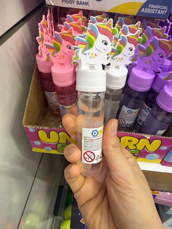 Renkli unicorn figürlü kapaklı, şeffaf gövdeli köpük oyuncak. Eğlenceli bir koleksiyonun parçasıdır.