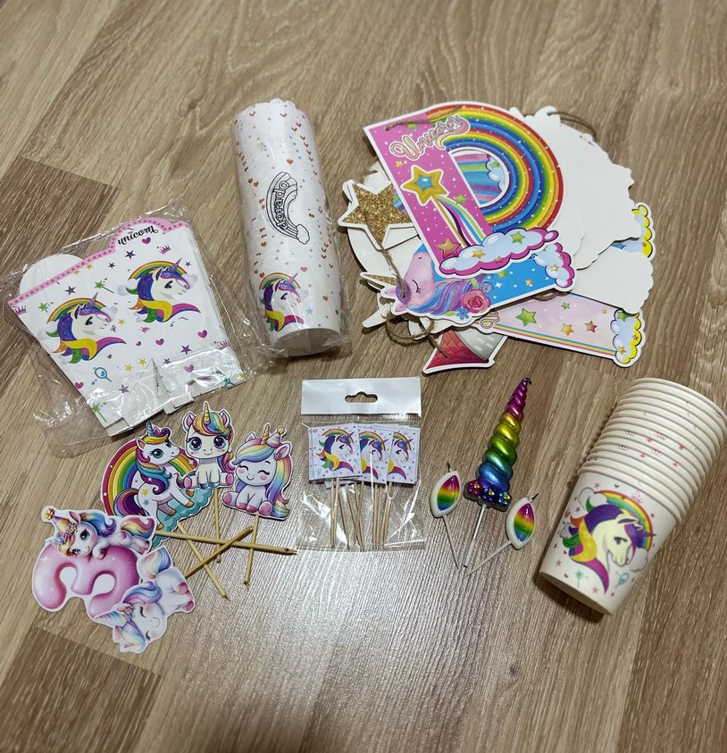 iyiki doğdun yazısı, cupcake, mısır kutusu, kürdan seti, pasta süsü, bardak ve unicorn şeklinde mumu görseldekilerin hepsi dahildir.