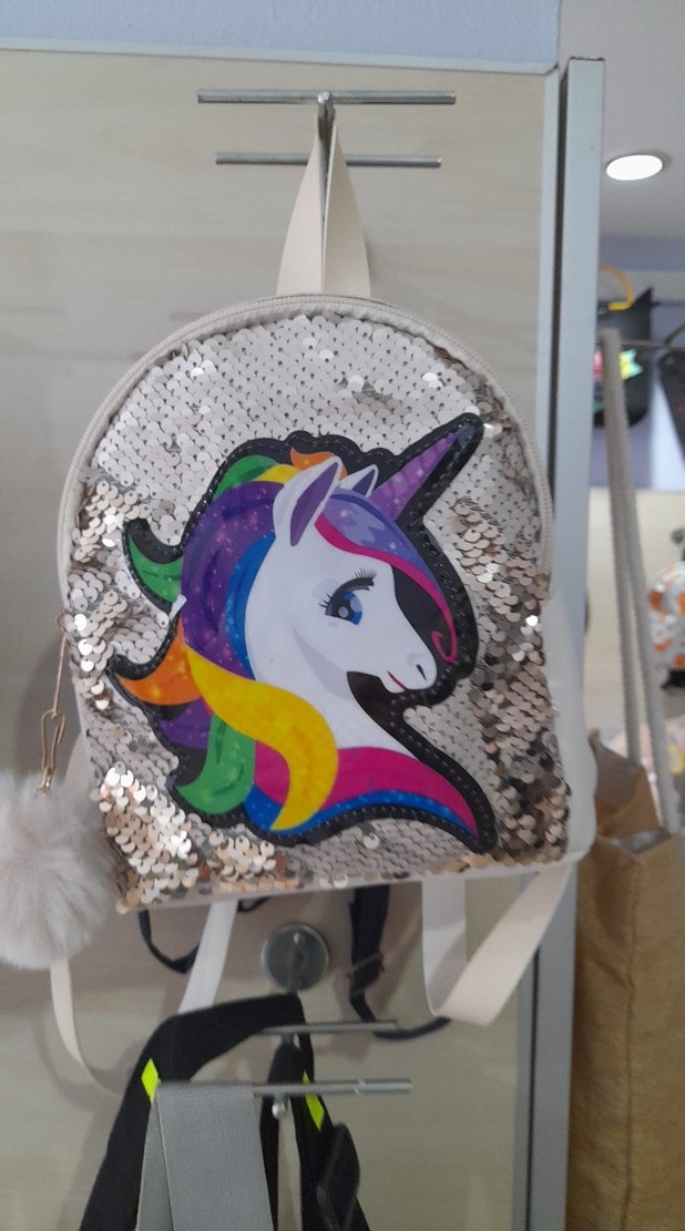 Parlak payetlerle kaplı, renkli unicorn desenli kız çocuk sırt çantası. Ayarlanabilir askıları ve yumuşak ponpon aksesuarı bulunur.