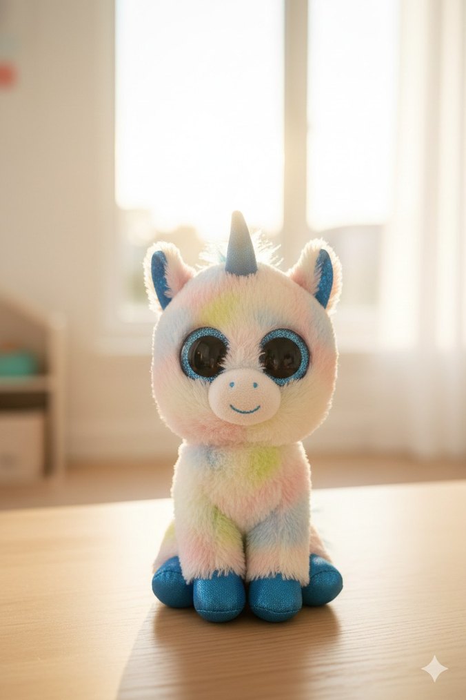 Yumuşak ve renkli unicorn peluş oyuncak, büyük gözlü ve mavi detaylı kulak ve ayaklarıyla. Sarılmalık bir arkadaş.
