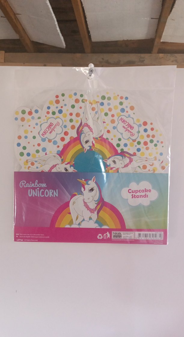 Renkli unicorn ve gökkuşağı desenleriyle süslenmiş cupcake standı, parti düzenine neşeli bir dokunuş katıyor. Üzerinde 'Cupcake Standi' ve 'Rainbow UNiCORN' yazıları bulunur.